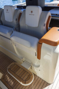 Evidentemente es una embarcación para disfrutar en el exterior, con amplios pasillos que permiten transitar por cubierta con seguridad y llegar a la proa donde seguramente deseará frenar el tiempo sentado en un sofá convertible en tumbona de exuberante comodidad.