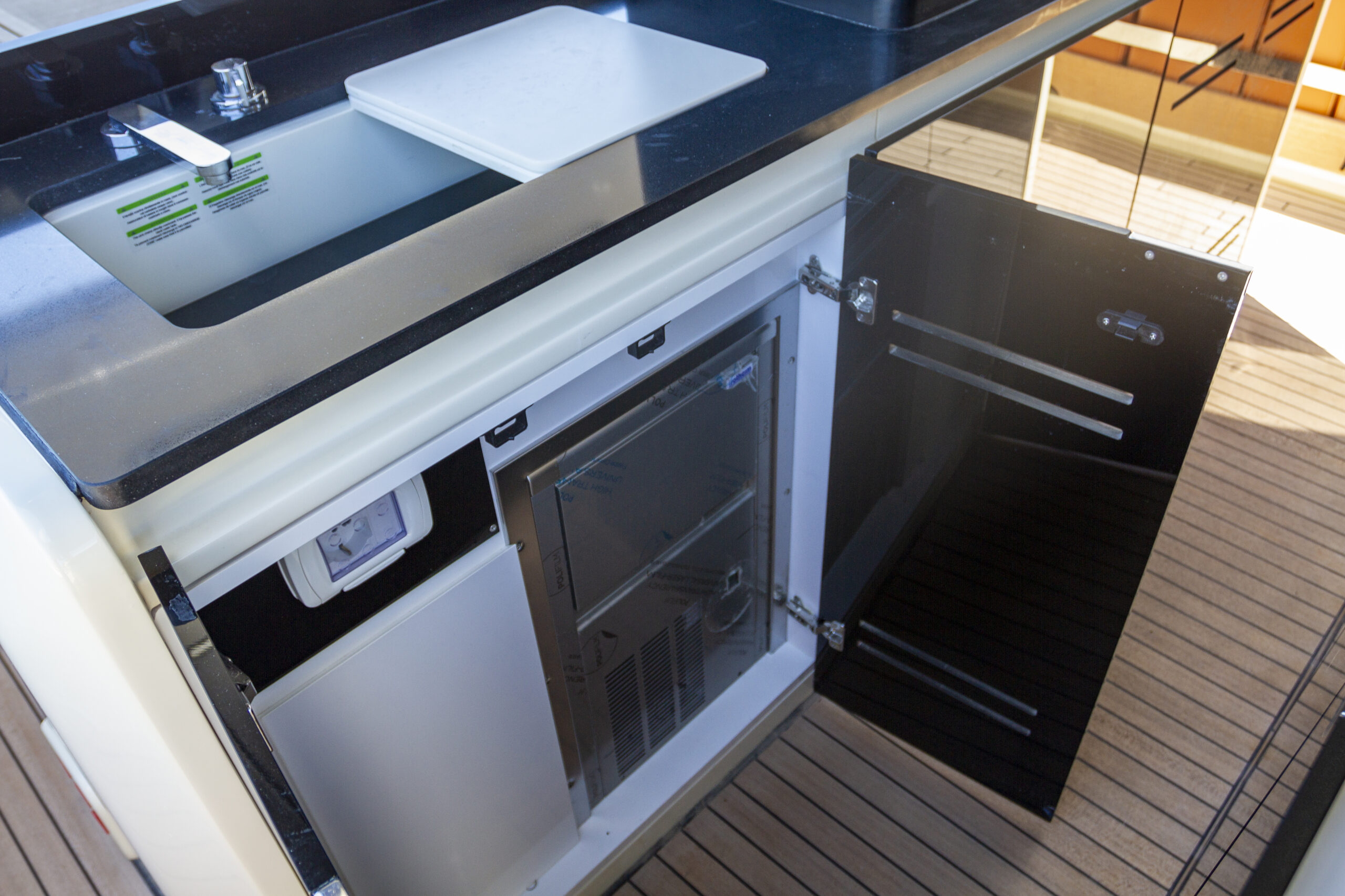 La disposición principal del techo rígido, totalmente confeccionado en fibra de carbono, desciende en la columna central hacia el interior del barco haciéndose firme al casco de manera que se complementan estructuralmente y da rigidez al conjunto. Sobre cubierta, en la base de la columna, se ha dispuesto la cocina exterior de forma que tanto el fregadero como los fogones quedan ocultos. Posiblemente es la pieza más minimalista de toda la embarcación, pero alberga todo lo necesario, principalmente diferentes neveras para refrescar abundante bebida.