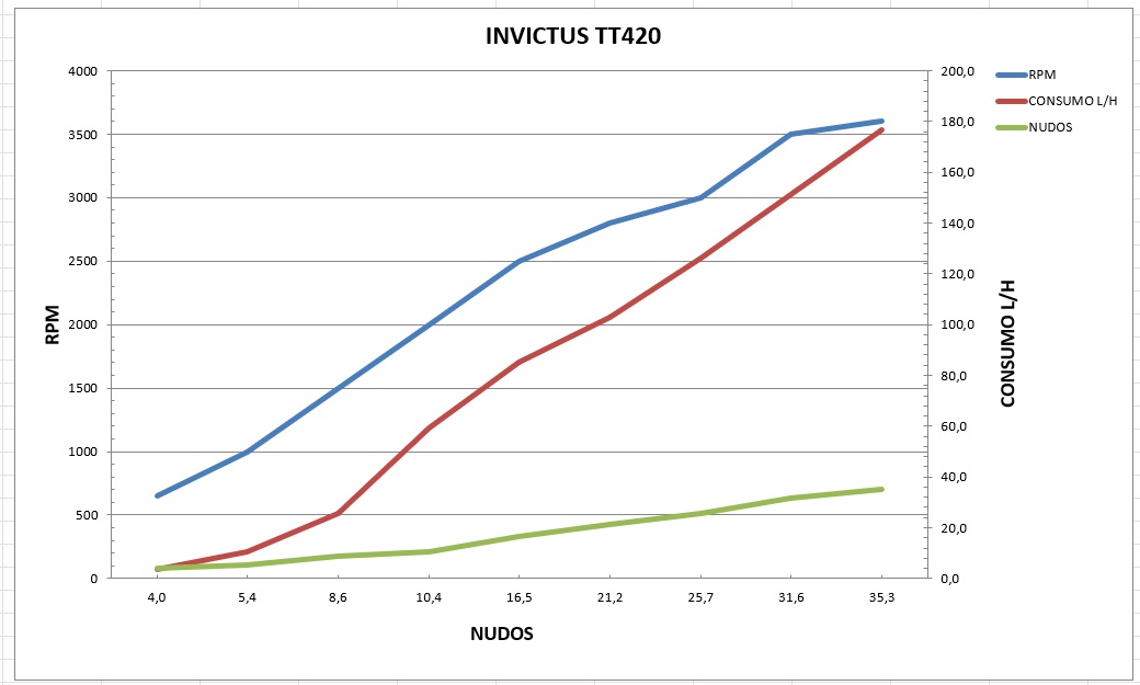 El gráfico muestra la correlación entre RPM, velocidades y consumos de la Invictus TT420 motorizada con con dos Volvo Penta Aquamatic D6 440 hp DPI.
