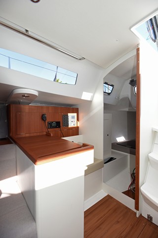 El interior del J/99 es el propio de un velero de uso mixto. Es correcto en acabados, en la línea a que nos tiene acostumbrados J Composites, clásico en distribución y moderno en aspecto. Vaya por delante que, en aspectos constructivos, el J/99, como todos los J, no admiten crítica: todos los mamparos están laminados o encolados al casco y cubierta, el mamparo principal es de sándwich composite y hay una rejilla estructural también en composite de alta resistencia que recoge las cargas de quilla y palo así como las del mamparo principal.