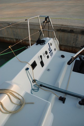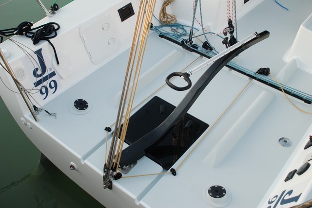 El J/99 es el primer modelo que equipa un botalón fijo de carbono desmontable ya que va atornillado a la roda con dos perno, lo que facilita sacarlo en puerto.