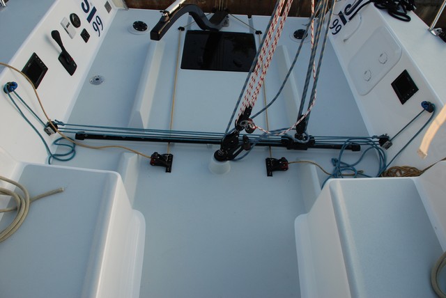 Por su parte, el carro de escota de mayor se extiende a los pies de la bañera a toda la manga y la escota va montada fija en el centro de la bañera sobre torreta giratoria con una desmultiplicación 6:1 y 24:1 de trimado fino. Ambos, además del baquestay son fácilmente manejables desde la posición de sentados a la banda. Los winches primarios autocazantes de dos velocidades se encuentran bien al alcance del caña mientras que los secundarios están situados a ambo lados del tambucho.