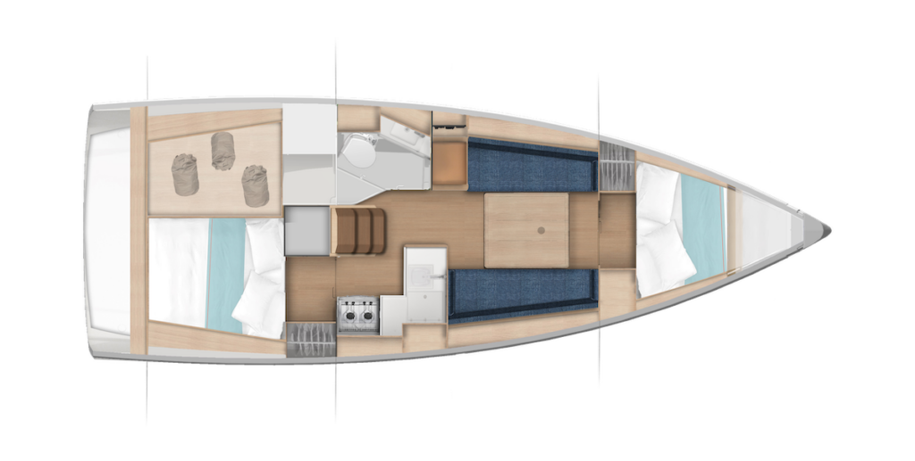 El Sun Odyssey 350 se beneficia de un plano de cubierta cuidadosamente estudiado para una navegación segura y para una vida a bordo sencilla y agradable. Jeanneau ha integrado la solución de las cubiertas laterales walk around para un desplazamiento fluido y seguro a bordo, lo que se añade a una cubierta enrasada para no tener que subir escalones. Este plano de cubierta contribuye a un manejo más intuitivo de las velas y preserva la bañera, una verdadera isla central con brazola de protección. El timonel también se beneficia de un mayor confort y de una mejor visibilidad hacia proa, gracias a los timones de popa descentrados con dos ruedas de timón. Sin backstay, el aparejo cuenta con crucetas atrasadas hasta 30°, lo que permite al timonel gobernar cómodamente sentado en las aletas.