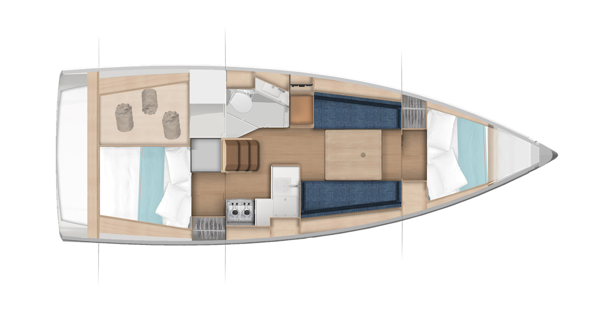 El Sun Odyssey 350 se beneficia de un plano de cubierta cuidadosamente estudiado para una navegación segura y para una vida a bordo sencilla y agradable. Jeanneau ha integrado la solución de las cubiertas laterales walk around para un desplazamiento fluido y seguro a bordo, lo que se añade a una cubierta enrasada para no tener que subir escalones. Este plano de cubierta contribuye a un manejo más intuitivo de las velas y preserva la bañera, una verdadera isla central con brazola de protección. El timonel también se beneficia de un mayor confort y de una mejor visibilidad hacia proa, gracias a los timones de popa descentrados con dos ruedas de timón. Sin backstay, el aparejo cuenta con crucetas atrasadas hasta 30°, lo que permite al timonel gobernar cómodamente sentado en las aletas.