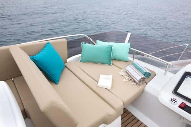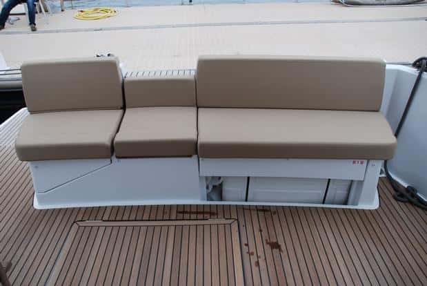 Por el contrario, en la cubierta principal, la Velasco 43 ofrece dos particularidades, la puerta lateral de acceso directo al puesto de gobierno, y la posibilidad de formar una dinete en la bañera de popa, con un banco que abarca prácticamente todo el espejo. La plataforma opcionalmente puede ser hidráulica con el fin de bajar el anexo o facilitar el baño. Las correderas de la entrada al salón permiten dejar en contacto directo la zona interior con la bañera de popa, de modo que la sensación de amplitud se incrementa al comunicar ambos espacios. Se agradecen los pasos laterales, muy bien protegidos y con pasamanos adosados a la cabina, así como la maniobra y los herrajes de amarre y fondeo, tanto en proa como en popa. El solárium de cubierta (con las colchonetas opcionales) es otro complemento que refuerza el carácter familiar de este barco.