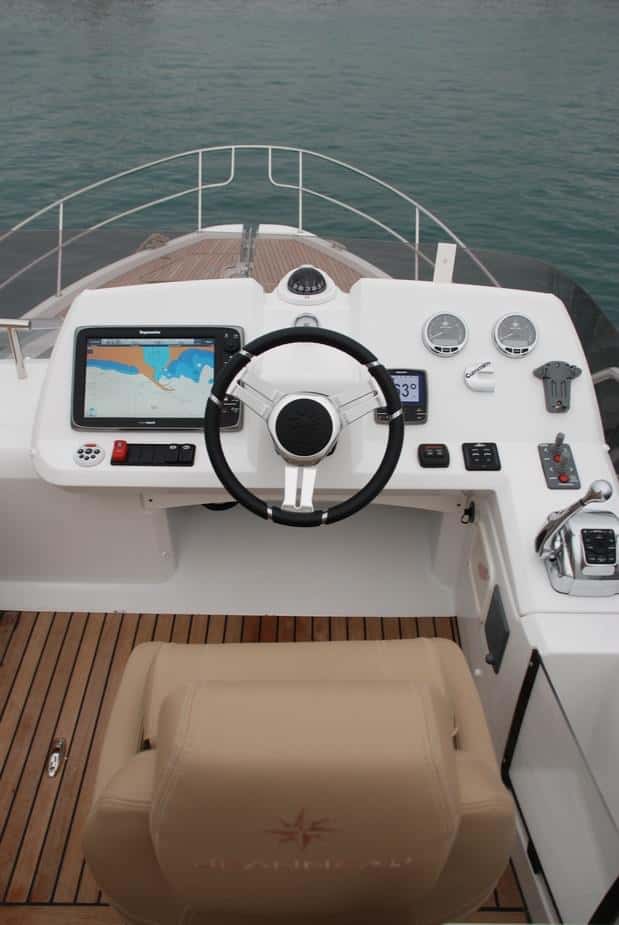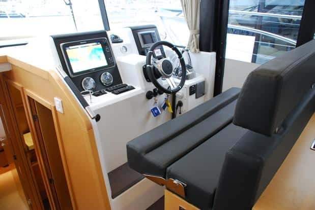 Entre los aspectos más destacables de este barco se cuenta el puesto de gobierno interior. En efecto, la visibilidad de 360 grados desde el asiento del piloto, la puerta lateral y la sencilla pero bien ordenada consola, ubicada a estribor, determinan este espacio sumamente funcional, poco vistoso pero ergonómico, muy cómodo y, como hemos apuntado, libre en cualquier ángulo de visión. Como en el puesto del fly, también a estribor, la sobriedad de la consola contribuye por otra parte a tener toda la instrumentación bien ordenada y bajo control. Los mandos electrónicos de Cummins cuentan con su espacio específico, tanto arriba como en el interior, y las formas del panel se han concebido para tener el volante bastante elevado consiguiendo que sea cómodo tanto para gobernar de pie como sentados. El asiento del interior, para dos plazas (un poco justas) se levanta, y no falta un buen reposapiés.