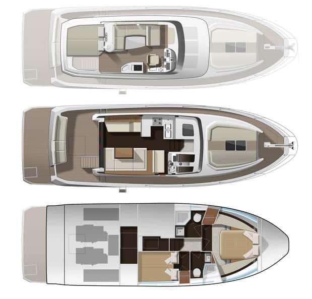 Un barco de programa familiar, sin excesivos lujos en la decoración, práctico y funcional, hecho para pasar semanas a bordo y con una autonomía más que aceptable a regímenes de crucero. Sin embargo, siguiendo la tendencia del mercado, la lista de opcionales contempla demasiados equipos que resultan prácticamente indispensables en este barco, empezando por la electrónica, y continuando con las colchonetas de solárium, la toma de agua dulce de puerto, el equipo de fondeo, los flaps, y un largo etcétera. Por el contrario, en cuanto a acabados, diseño, y concepto, este barco cumple sobradamente con las expectativas de quienes busquen un buen apartamento flotante, amplio, luminoso y con la garantía de una gran marca como es Jeanneau. Por esto, y no en vano, ha sido galrdonado por las revistas europeas especializadas al galardón del European Powerboat of the Year 2014.