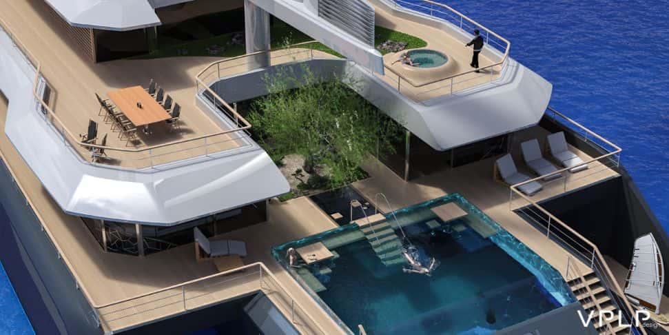 En la cubierta principal se distribuyen las zonas comunes,comedor, salón .. y las zonas de invitados y tripulación. La estrella de esta cubierta son la piscina y el patio japonés ubicado en el centro de la embarcación.
