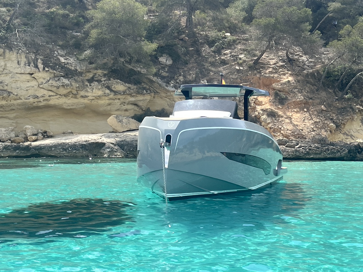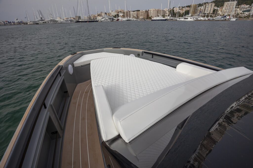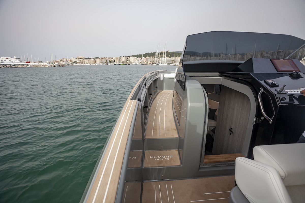 Con el mar en calma de las primeras horas de la mañana en la magnífica bahía de Palma, la Kumbra 34 mostró su mejor cara, con puntas de más de 42 nudos y una velocidad de crucero alta de 24 nudos. Es en esta velocidad donde el step de la carena muestra su efectividad, variando la estela hacia popa y creando un planeo imperceptible en las líneas del asiento.