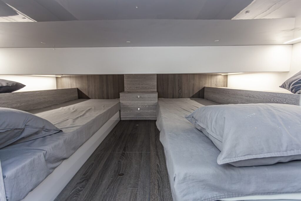 La cabina doble, con dos camas debajo de la bañera, es muy agradable gracias a los portillos fijos rectangulares en sus costados que aportan mucha luz, pero solo se usará para dormir, puesto que no hay altura suficiente para hacer vida en él.