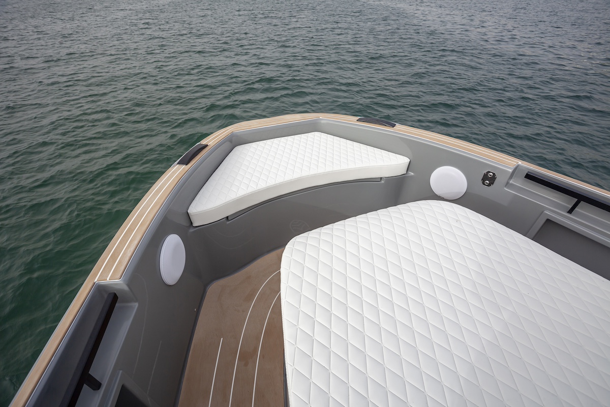 En popa, el sofá se convierte en un solárium que esconde dos cofres de estiba, perfectos para defensas, cabos de amarre y material diverso.