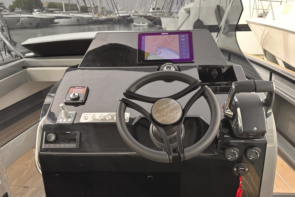 La zona de navegación en el puesto de gobierno es lo suficientemente amplia para instalar tres sillones confortables, con acabados propios de embarcaciones mayores o de alta gama. Esta queda protegida por un parabrisas, para evitar los posibles rociones. En nuestra prueba, el barco no se vio salpicado, salvo en el momento de reducir la velocidad, y fue más por acción del viento que por las formas del casco.