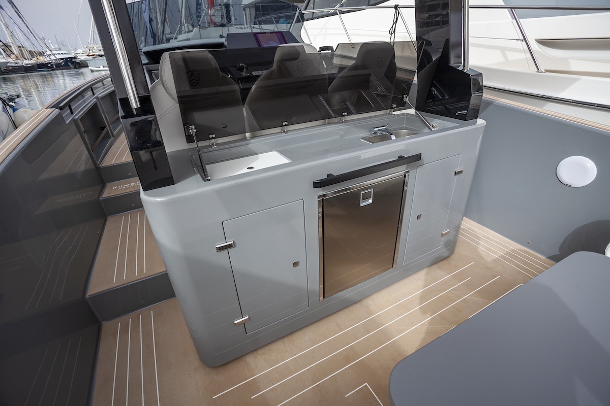 La bañera es amplia y ofrece un espacio cómodo con mesa y sofá para seis personas. La cocina exterior se ha dispuesto a espaldas de los asientos del puesto de mando e incluye nevera y abundante espacio de estiba.