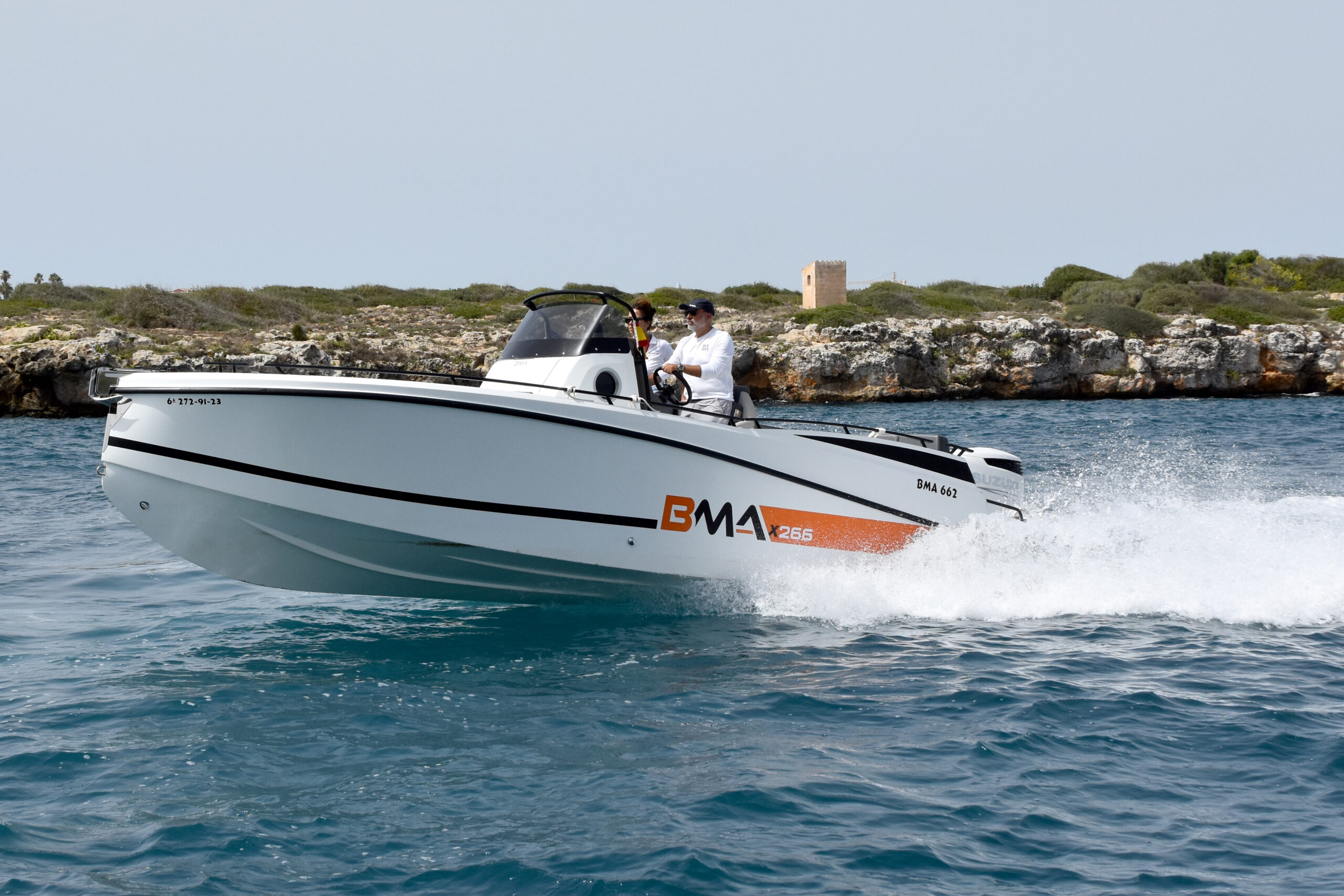 Diseñada por el estudio de Carlos Vidal, este modelo, con el característico diseño de BMA, mantiene las líneas deportivas y una amplia cubierta de proa, altos francobordos y motorización fueraborda. En este modelo el espacio destinado a la relajación toma más protagonismo, con un gran solárium en proa y una asiento en popa en forma de L convertible también en solárium. Dispone de una consola central con puesto de gobierno con asientos individuales de gran confort y cocina móvil. El interior con camas a proa y popa, aporta algunas soluciones innovadoras, como las escaleras de acceso retráctiles. La zona de proa es convertible en dinette y para completar el habitáculo hay una cabina de aseo independiente.