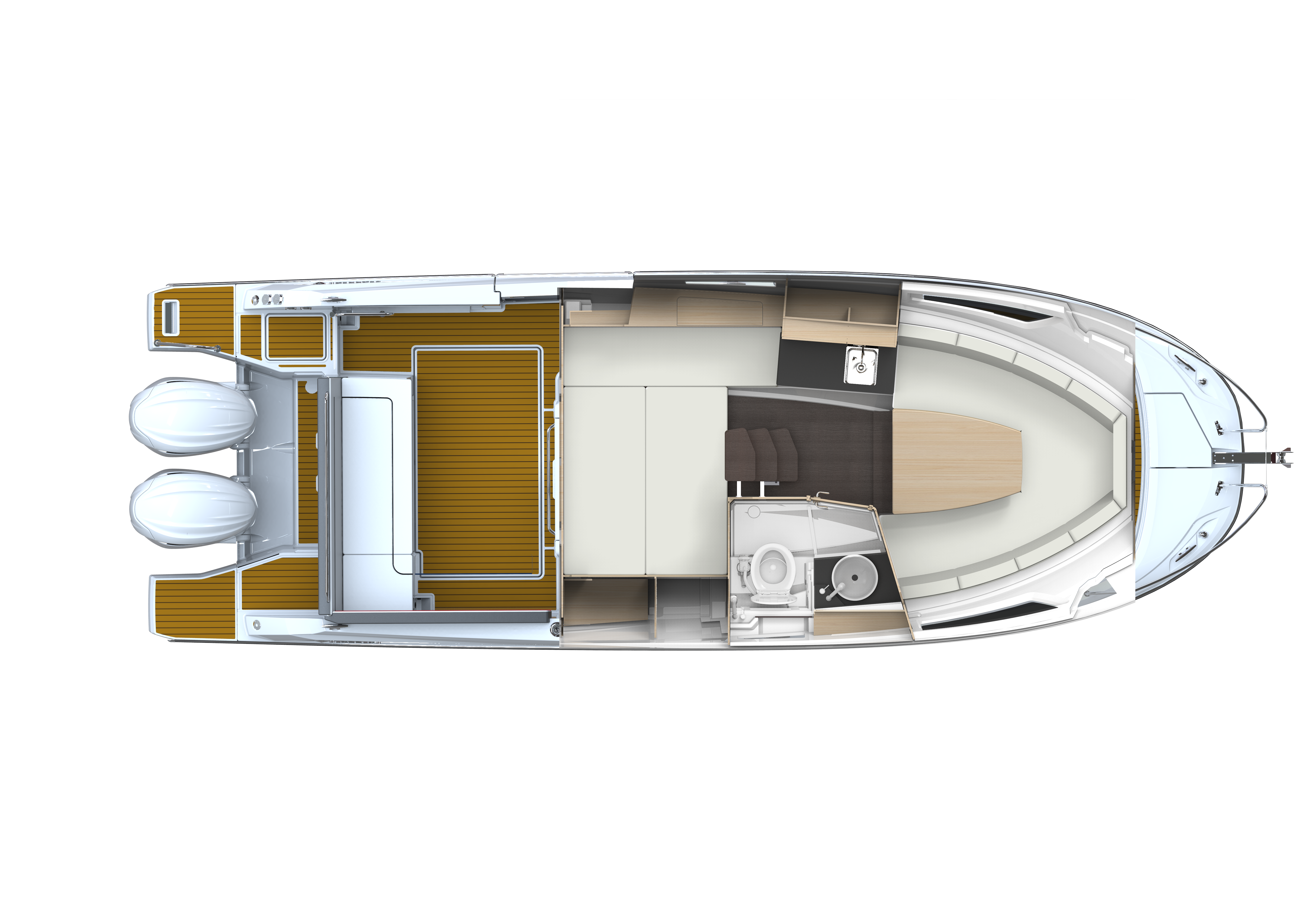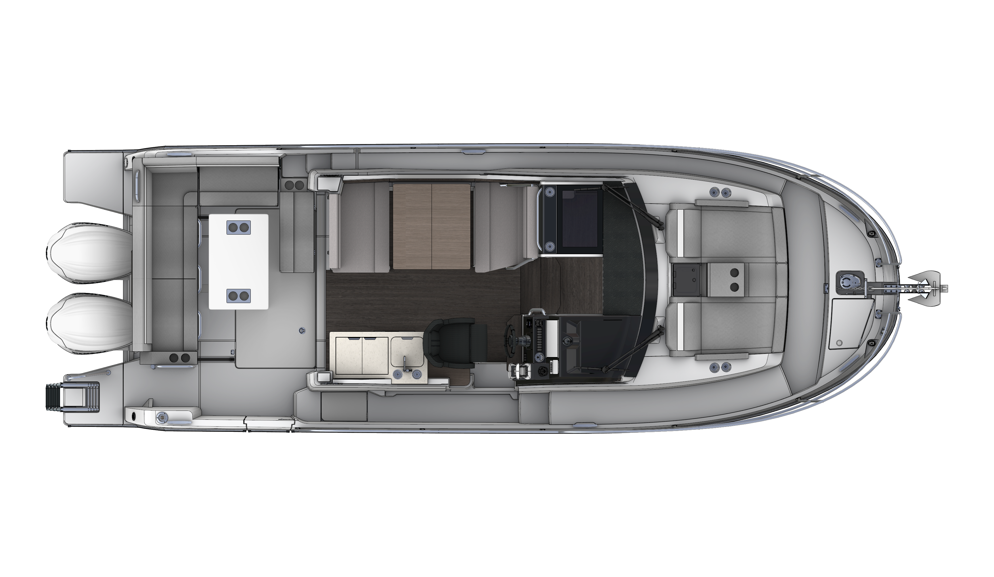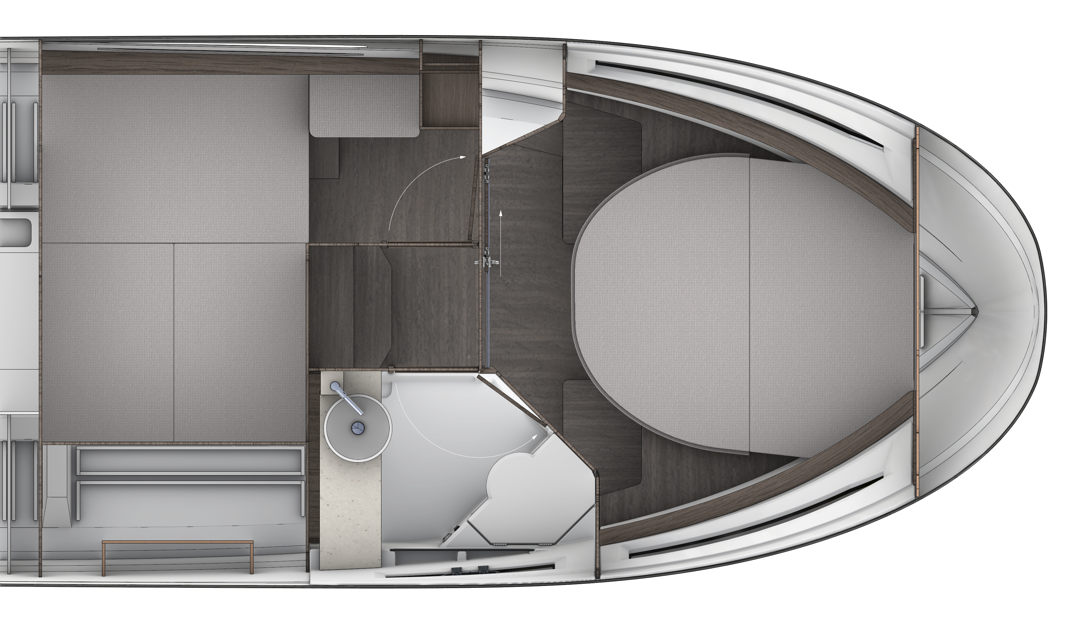 En el interior, la carpintería es de nogal gris, con encimeras de Corian en la cocina y tapicería contemporánea. Amplias puertas correderas de cristal, así como ventanas en el casco y la cubierta, difunden un máximo de luz natural. La cocina, práctica y bien equipada, cuenta con abundante espacio de almacenamiento. El asiento giratorio del piloto en el salón y el mini bar en la prolongación de la cocina invitan a la socialización Con dos camarotes, este nuevo weekender está perfectamente diseñado para salidas largas, tanto diurnas como pernoctando a bordo.