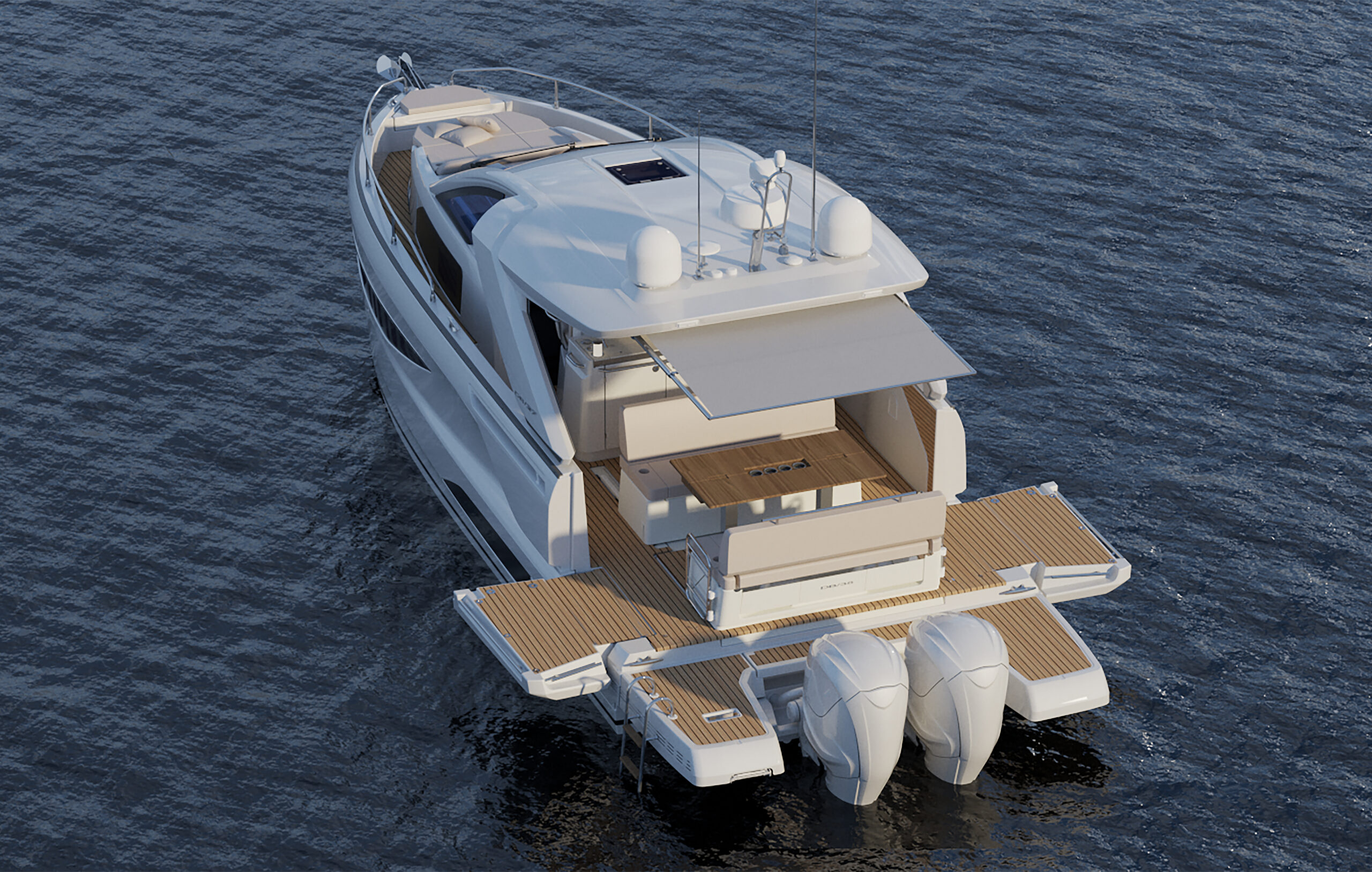 Desarrollada mediante pruebas en tanque, la nueva forma del casco creado por Jeanneau y Centkowski& Denert se propulsa con dos Yamaha de 250 Hp y joystick y permite un planeo aún más rápido y un buen crucero a velocidades medias.