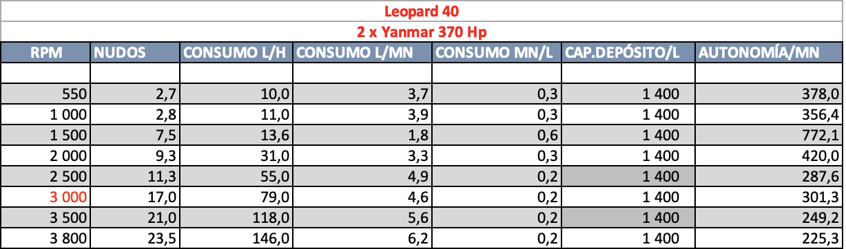 Autonomía: en torno a unas 225 millas a régimen máximo y unas 300  millas a régimen de crucero de 17 nudos.