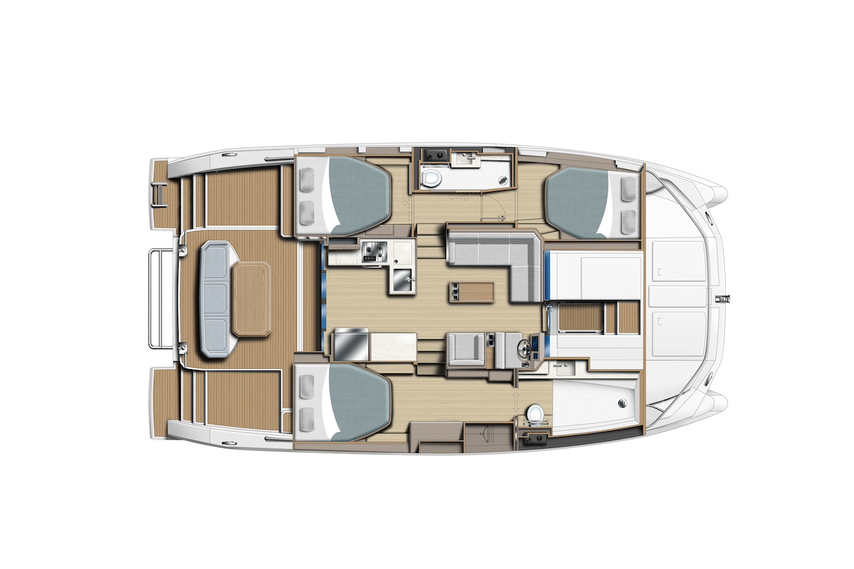 Con acceso en la zona media del salón, las tres cabinas se benefician de generosas camas tipo isla y con vistas al mar a través de las ventanas practicadas en los casco. Hay dos aseos situados a babor y otro, de generosas dimensiones, a estribor para el camarote del armador que ocupa toda la zona de proa.
