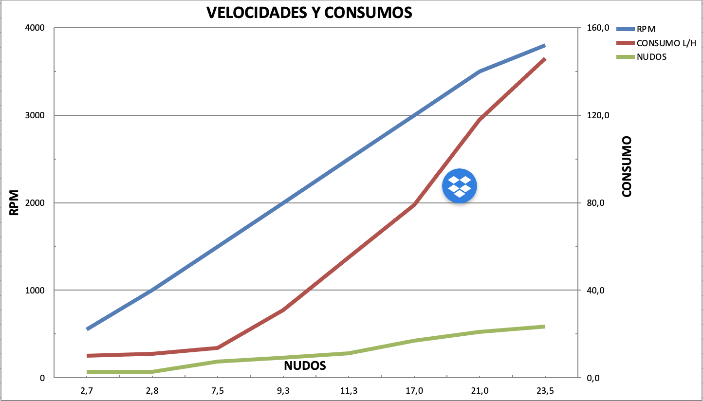 Velocidad máxima: 23,5 nudos a 3.800 rpm.