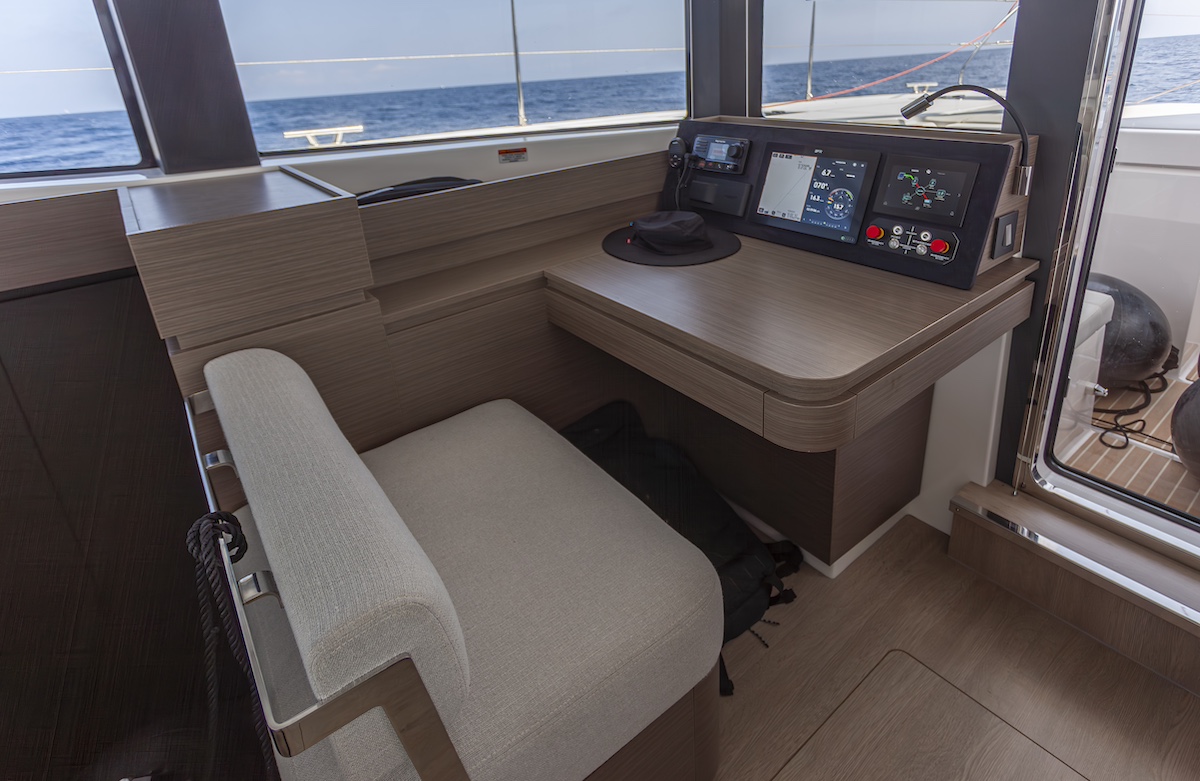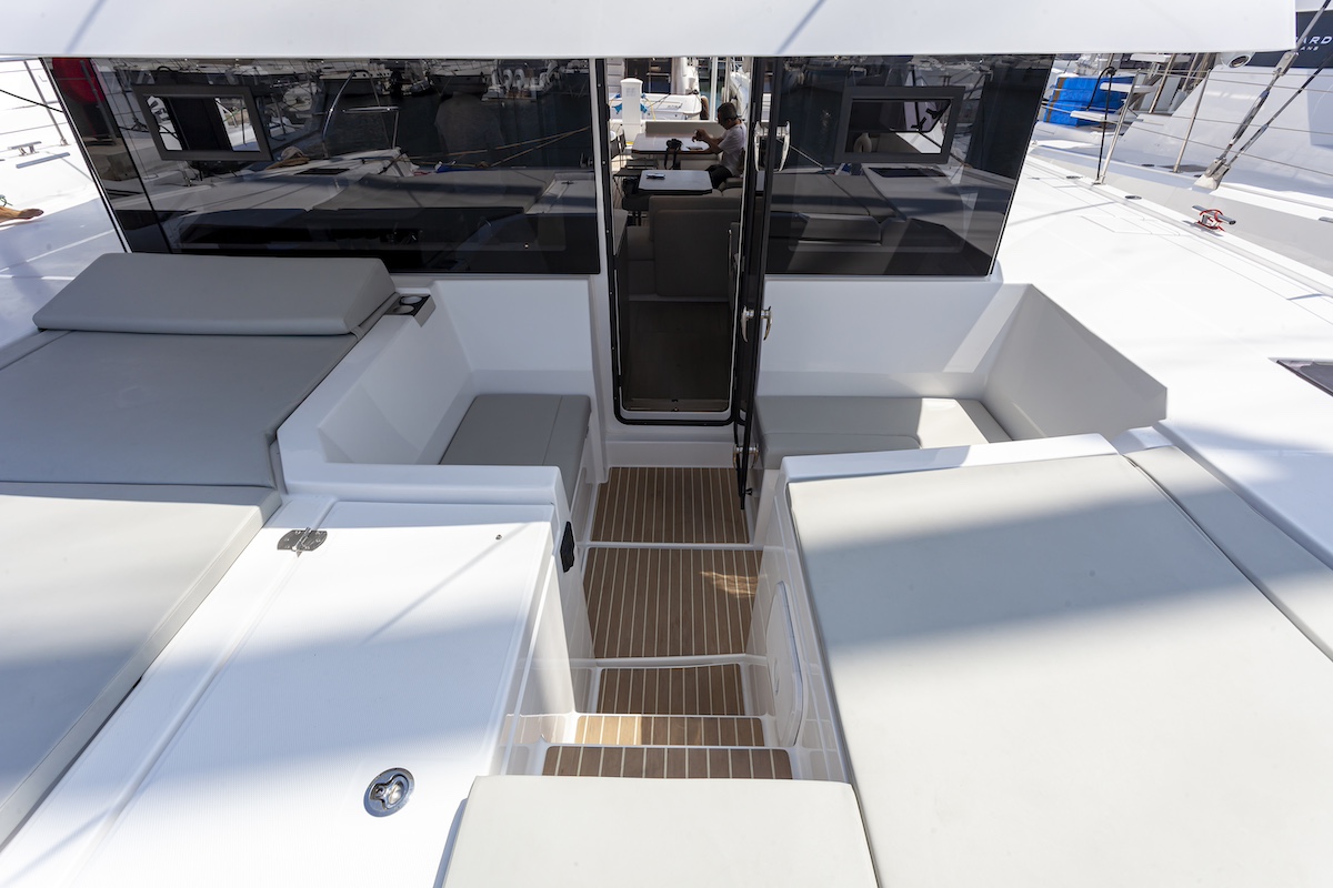 Bajo esta protección, funcional a la vez que útil, disponemos de una mesa rodeada de sofás a una banda y otro sofá con respaldo reclinado en la otra. La plataforma de popa entre los cascos está al mismo nivel y existe la opción de instalar tras ella una plataforma elevadora eléctrica para el auxiliar. Anteriormente, esta opción estaba reservada para los Leopard de mayor tamaño, por lo que es la primera vez que la ofrece en esta eslora. El puesto de gobierno exterior ha evolucionado respecto al anterior modelo. Todas las líneas, winches e instrumentos están al alcance de la mano para mantener una de las claves del éxito de los Leopard: la posibilidad de navegar en solitario.