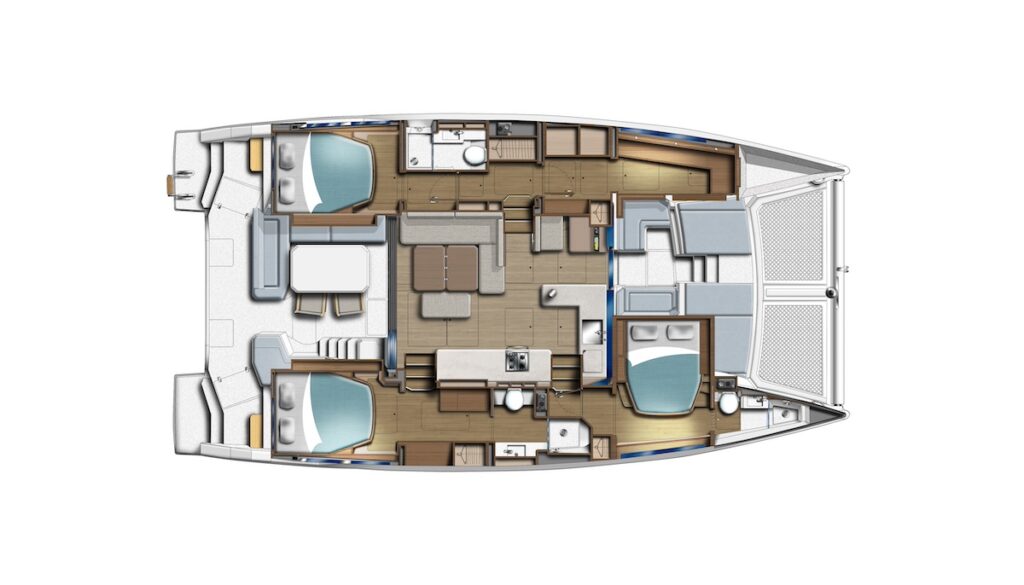 Aclarado esto, centrémonos en el barco en que navegamos. Recordemos solamente, a modo de preámbulo, que los Leopard fueron, hasta donde nosotros sabemos, los primeros catamaranes que permitían el acceso directo desde el salón a la bañera de proa —un verdadero salón al aire libre— sin pasar por las bandas y a través de una puerta corredera de vidrio, una solución que desde hace unos años han adoptado muchas marcas.