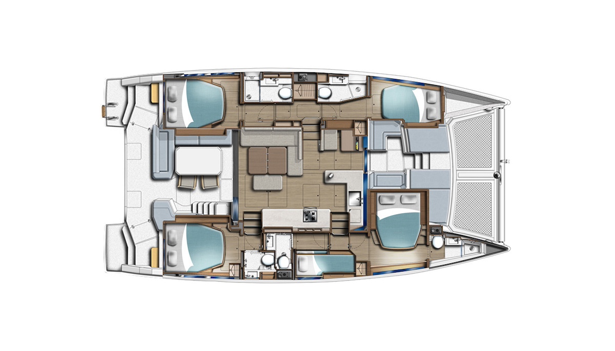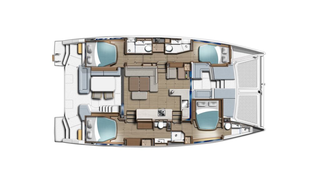 El interior ofrece una distribución sorprendente en un barco de este tamaño, ya que integra el interior del casco de estribor completamente en el pique de proa, lo que permite un camarote central adicional a estribor con literas superiores e inferiores, ideal para un patrón o para dos niños. El resultado es un amplio camarote para el armador, dos dobles de invitados y la mencionada cabina central. Cinco en total, pero con la posibilidad de convertir el de proa de babor en una cabina de servicio utilizable como lavandería, taller u oficina para quienes trabajan desde su barco. Cada cabina dispone de su propio baño privado.
