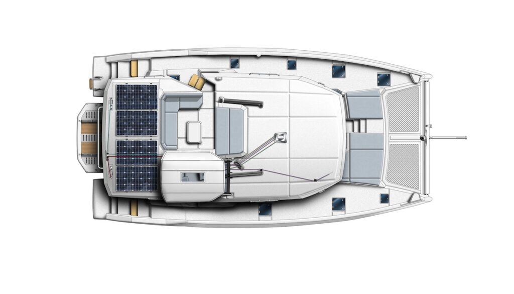 Al situar el salón lo más hacia proa posible, sobre el tejadillo de la bañera hay superficie suficiente para cuatro paneles solares de 400 W. Esto evita la necesidad de instalar voluminosos arcos targa en popa para soportar los paneles.