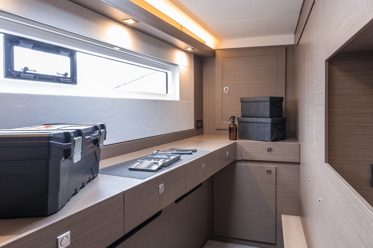 En las versiones de cuatro o cinco cabinas, una de ellas puede destinarse a pañol de servicio, especialmente útil en largas estancias a bordo.