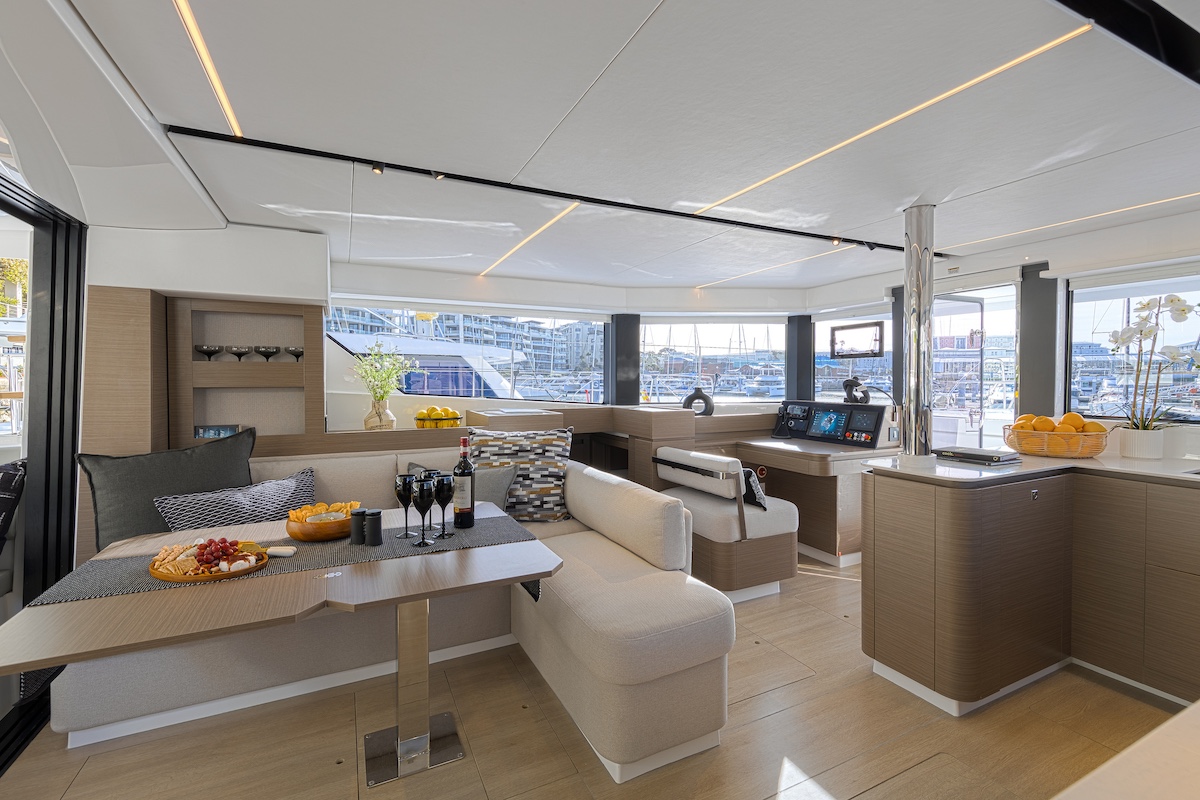 Aclarado esto, centrémonos en el barco en que navegamos. Recordemos solamente, a modo de preámbulo, que los Leopard fueron, hasta donde nosotros sabemos, los primeros catamaranes que permitían el acceso directo desde el salón a la bañera de proa —un verdadero salón al aire libre— sin pasar por las bandas y a través de una puerta corredera de vidrio, una solución que desde hace unos años han adoptado muchas marcas.
