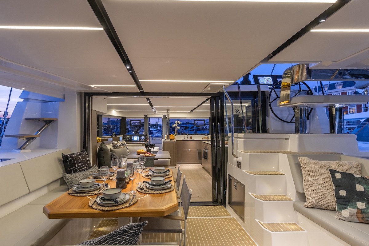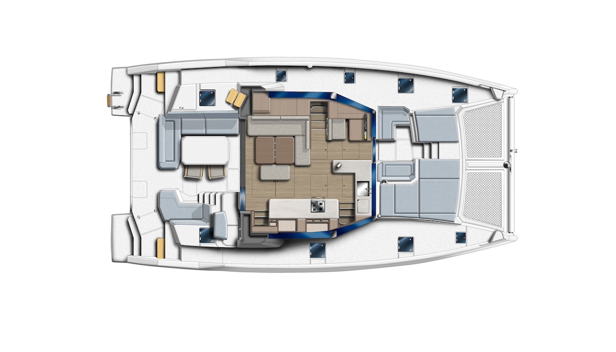Bajo esta protección, funcional a la vez que útil, disponemos de una mesa rodeada de sofás a una banda y otro sofá con respaldo reclinado en la otra. La plataforma de popa entre los cascos está al mismo nivel y existe la opción de instalar tras ella una plataforma elevadora eléctrica para el auxiliar. Anteriormente, esta opción estaba reservada para los Leopard de mayor tamaño, por lo que es la primera vez que la ofrece en esta eslora. El puesto de gobierno exterior ha evolucionado respecto al anterior modelo. Todas las líneas, winches e instrumentos están al alcance de la mano para mantener una de las claves del éxito de los Leopard: la posibilidad de navegar en solitario.