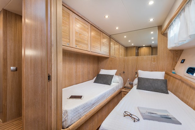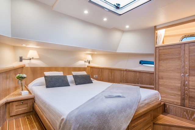 La cabina del armador se sitúa a media eslora, y dependiendo de la versión, puede abarcar toda la manga o compartir este espacio con otro camarote gemelos. El de proa y el doble situado a estribor, con dos literas, completan la distribución de la zona de noche.