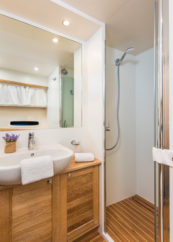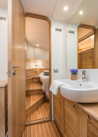 La unidad que navegamos, obviamente realizada según las preferencias del armador, cumplía con una planta de cuatro cabinas dobles con sus respectivos aseos, además de la de marinería. Cada camarote dispone de ventilación natural y armarios roperos, además de su aseo completo con ducha separada.