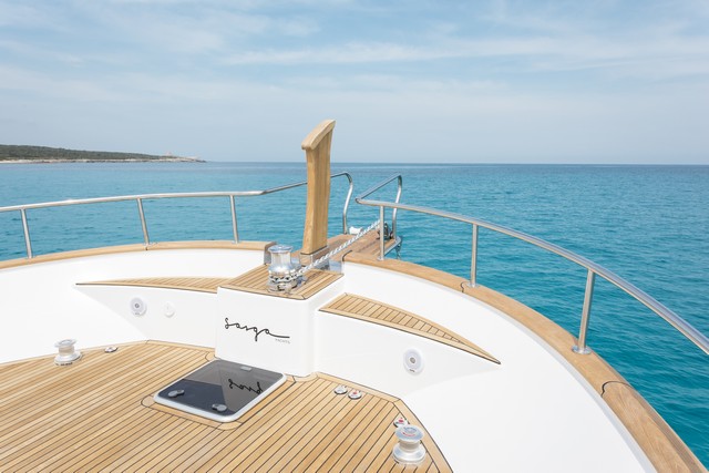 En los exteriores destaca la enorme plataforma de baño, preparada para el anexo; los pasos laterales protegidos por altos pasamanos, el solárium de proa sobre el techo de la cabina con un banco (que en la unidad que navegamos se había omitido, y la maniobra de fondeo y amarre, que culmina en el arrufo clásico de las amuras.