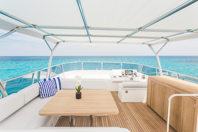 El flybridge es otra área importante en este modelo, pues demás de ofrecer el segundo puesto de gobierno, disfruta de una amplia dinete complementada por un mueble de servicio que se puede equipar según las necesidades del propietario: nevera, parrilla, máquina de cubitos, etc. Además de contar con un enorme solárium, en la zona posterior queda una superficie libre a modo de terraza que admite hamacas colchonetas de solárium u otros elementos similares.