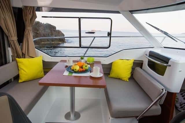 La dinete interior se transforma en cama doble. También puede bascular el respaldo de proa para formas un asiento mirando hacia delante.