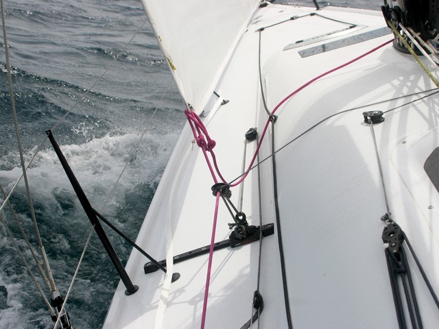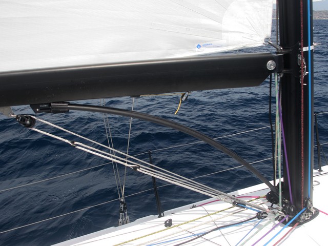 Si la bañera responde al concepto de ser lo más ergonómica posible en regata, la maniobra no se queda atrás. Hay una gran torreta para alojar las mordazas de los controles del aparejillo del back, la escota y el trimado fino de la mayor. Toda la maniobra del palo queda repartida en el piano a ambos lados del palo, con roldanas desviadoras, y junto a los winches primarios se encuentran los controles de escotas y barbers de génova, spi contra de tangón y amantillo. Por supuesto, el carril de escota de génova es transversal. La unidad probada estaba dotada de una contra rígida Barton y el tangón era de carbono reforzado con kevlar, mientras que el botalón era una pieza integral de carbono que se acopla a la proa.