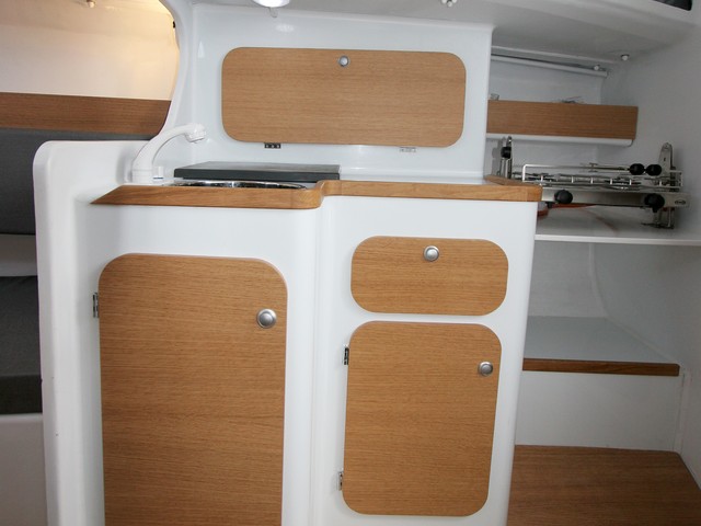 El interior es mínimo. Diríamos que espartano, pero con lo necesario. De serie, no hay puertas excepto la del aseo, si bien puede optarse por lonas de separación. La distribución incluye una cama doble en proa y otras dos en ambos camarotes de popa. Al de babor se accede a través del aseo. El espacio destinado o cocina permite instalar un horno y nevera eléctrica de apertura vertical. La mesa central es de dos alas plegables con botellero central y bajo los bancos hay cofres de estiba, así como tras sus respaldos, donde queda una pequeña superficie plana para librería.