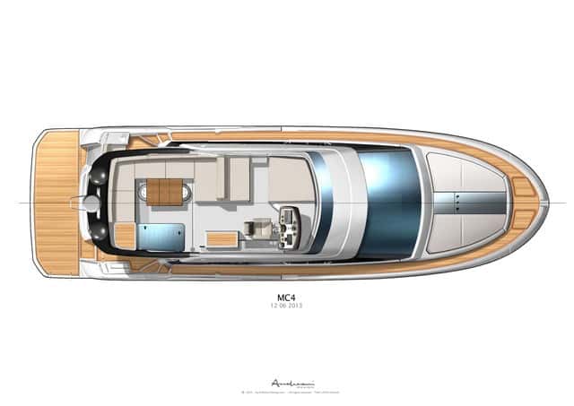 La MC4 destaca por su particular diseño, elegante y de formas equilibradas. Llama la atención por su espacioso flybridge, distribuido con una gran dinete capaz de acomodar hasta seis personas ampliamente, complementada por un mueble de servicio con parrilla, fregadero y nevera, y un banco a babor que se convierte en un espacioso solárium, junto al puesto de gobierno. Esta zona superior se prolonga hasta cubrir prácticamente toda la bañera de popa con el fin de optimizar la superficie disponible. No obstante, una toldina se esconde en la parte posterior del fly, desde done se extiende, para acabar de cubrir el banco de popa.