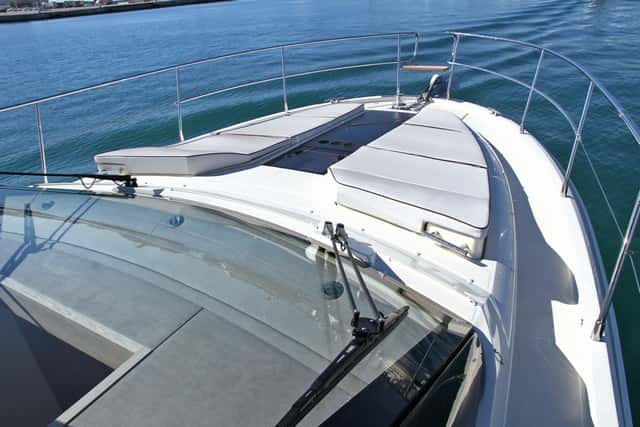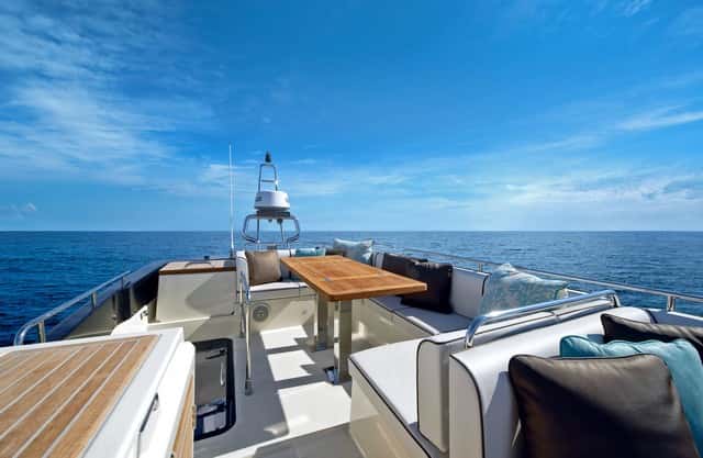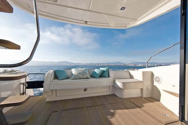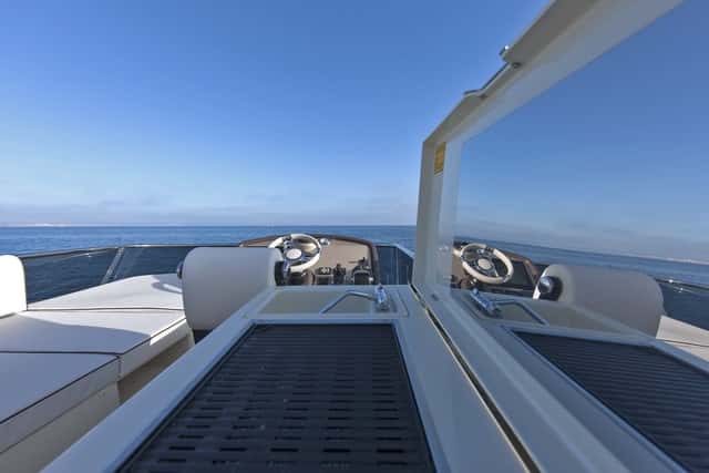 La popa está ocupada por un banco –con enorme cofre de estiba debajo- que respeta la entrada directa de la plataforma de baño (opcionalmente hidráulica). Aquí hay espacio suficiente para transportar un anexo de buenas dimensiones. La pasarela telescópica y los buenos herrajes de amarre en popa y proa, facilitan el acceso a puerto y el fondeo. La proa presenta un formidable pozo de anclas, y la cubierta queda ocupada por unas colchonetas de solárium en dos partes que respetan el tragaluz y la escotilla de la cabina de proa. Lo pasos laterales, no excesivamente anchos, cuentan con pasamanos altos que, por razones de diseño, no llegan hasta la proa y se quedan cortos.