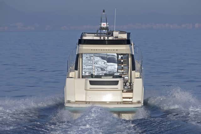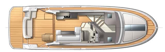 Como muchos otros astilleros, Monte Carlo tiene sus salones al mismo nivel que la bañera de popa con el fin de dar continuidad y complementar ambos espacios. Por esta razón el juego de cuatro puertas se recoge en el espacio de una sola, lo que permite configurar un único volumen entre la cabina y la bañera.