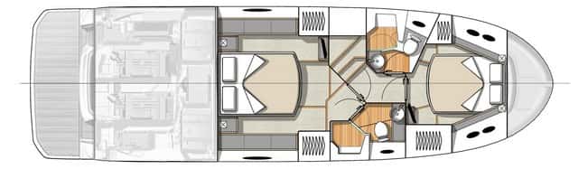 En la zona inferior reparte dos suites con sus correspondientes aseos privados. A popa, la cabina del armador aprovecha toda la manga del barco y cuenta con dos ventanas panorámicas para conseguir una atmósfera en la que predomina la luz natural. También es luminosa la cabina de proa, dotada de numerosos portillos. Ambos camarotes cuentan con roperos grandes y espacio de estiba bajo las literas, además de una decoración exquisita. Cada material se ha seleccionado con esmero: madera cepillada, cuero ablandado, tejidos con texturas preciosas, todo ello en una armonía de tonos suaves y refinados.