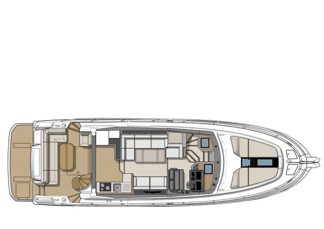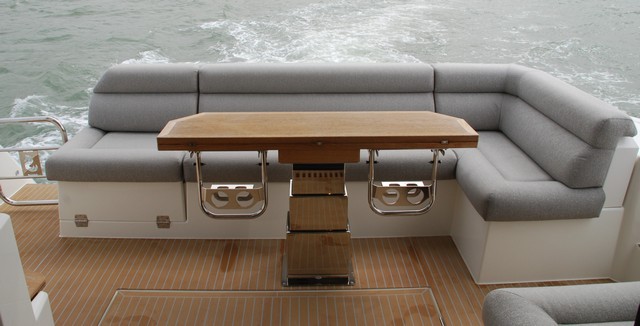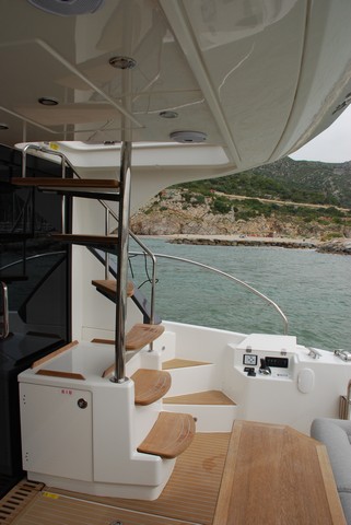 Esta 42 ofrece una amplia bañera con mesa convertible opcionalmente en solárium y escalera de acceso al fly volada. A babor, también opcionalmente un asiento acolchado opcional, mientras que en el módulo simétrico de estribor se alberga la balsa de salvamento.
