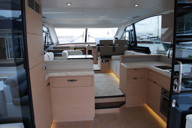 El interior de la caseta destaca por su altura, y por los grandes ventanales que la circundan sin prácticamente obstáculos visuales hacia el exterior, exceptuando los montantes estructurales de proa y popa. La cocina, como en todas las Monte Carlo se mantiene en popa del salón, pero en este 52 se amplía a lo ancho y largo, de forma que puede albergar una nevera vertical a toda la altura de dos puertas, que puede ser de tres, con dos congeladores.