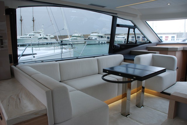 El flybridge, que puede estar cubierto por un bimini o bien opcionalmente por un hard top, es realmente grande y está organizado en tres zonas. La de popa ofrece un módulo de parrilla con una nevera muy capaz mientras que el centro está destinado a estar en toda su anchura. Por su parte, la zona del piloto a babor dispone de un confortable y ancho sofá en L al lado del piloto, bien protegido por el parabrisas. En próximas unidades existirá la posibilidad de que este sofá sea convertible en solárium.