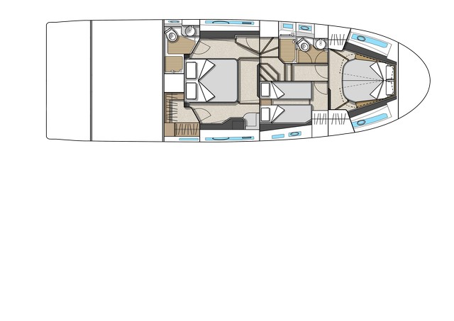Desde esta cubierta la escalera de bajada se divide y conduce por una parte a la cabina del propietario en popa o hacia las dos cabinas y baño de proa. La primera ocupa toda la manga, es alta y muy completa, con tocador-mesa de trabajo, con pupitre para un ordenador, estiba bajo la cama y Enel mamparo de proa con un gran armario para maletas sobre el que se sitúa la pantalla del televisor. La ducha se encuentra tras el cabezal de la cama contribuyendo0 así a la insonorización de la cabina. Destaca la altura que el diseño logra alrededor de la cama central, que en la MC5 era menor.