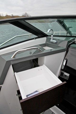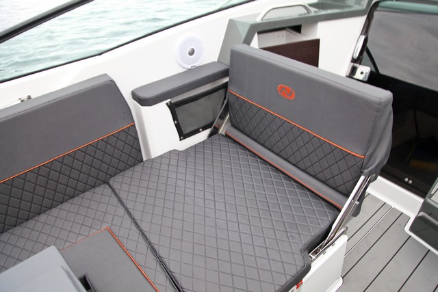 Un gran sofá a popa con prolongaciones por los lados permite formar una enorme U en tono a una mesa de alas plegables, o convertirlo en un solárium que ocupa prácticamente toda la bañera; y a babor un diván-solárium en la banda de babor junto a un pequeño módulo de servicio (con lavamanos y la nevera debajo del asiento), cuyo respaldo es basculante para que el asiento forme parte de la dinete de la bañera o del asiento del acompañante mirando en el sentido de la marcha. También se agradece que la toldina bimini se pueda desplegar en segundos, ya que cuenta con su correspondiente cofre de estiba en la popa, tras el banco de la bañera.