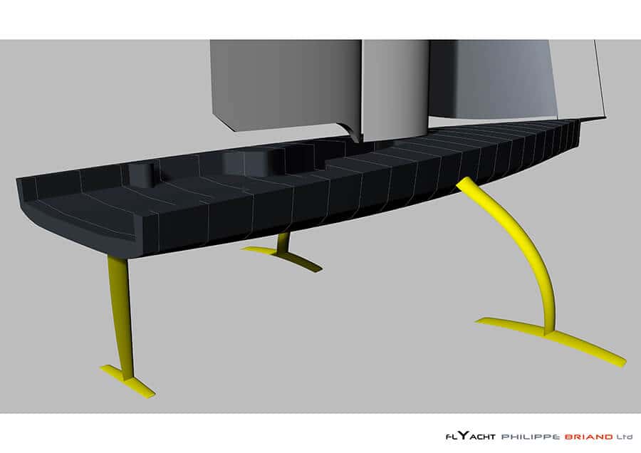 Con un par de adrizamiento de 90º, tanto como un Mini Transat, la posición de las hidroalas del Flyacht estará monitorizada y automatizada en favor de la seguridad y la estabilidad.