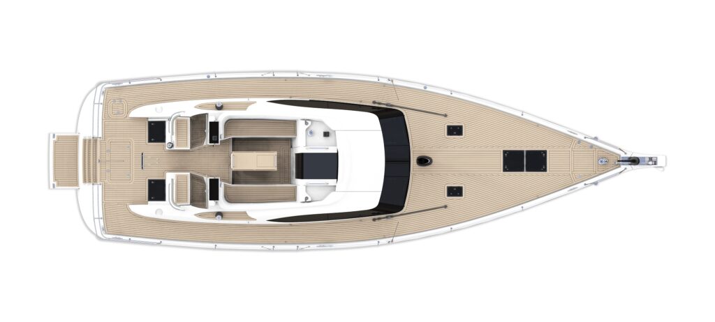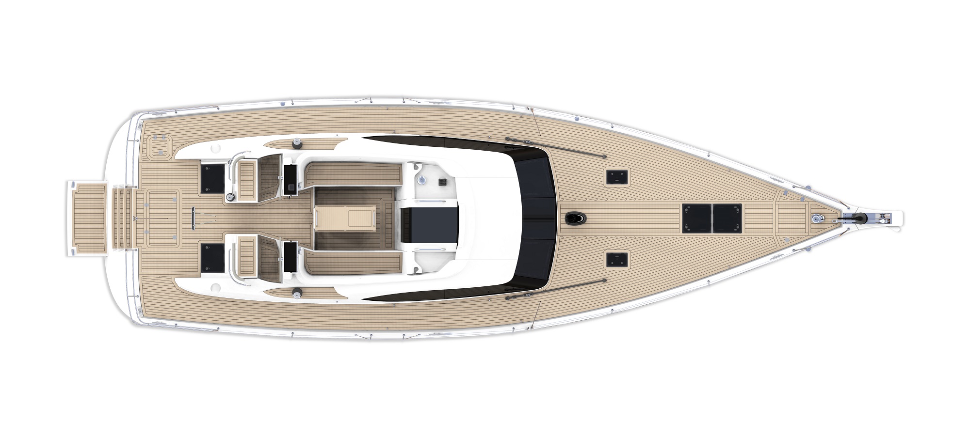 El aspecto exterior en su vista lateral repite las tres ventanas verticales del casco, marca de la casa, clave de iluminación y elegancia de la cabina de popa, mientras que la caseta se estiliza con una ventana en forma de ojo. La posición del mástil está bastante adelantada por lo que la bañera central y la caseta desciende en ángulo suave hacia proa, con tres ventanas de cristal tintado; dos de ellas practicables, una magnífica solución para una intensa ventilación interior.