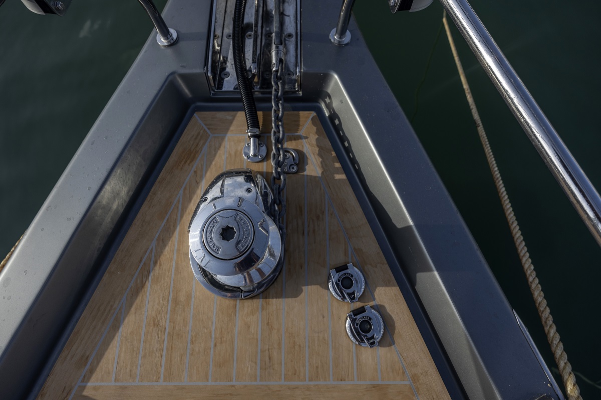 La proa es un espacio totalmente despejado y la sensación la acentúan las escotillas enrasadas, la posición de los cadenotes dirigidos directamente a la banda y la cubierta plana y en un mismo nivel de proa a popa que invita a caminar sin calzado.