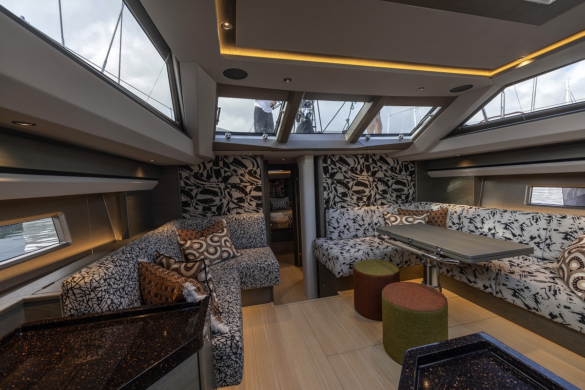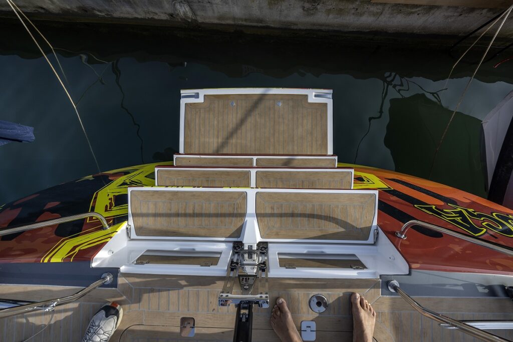 Las opciones de personalización son muy elevadas, a tal extremo que, desde el punto de vista estético, el barco que hemos tenido oportunidad de probar en Port Ginesta durante las jornadas de navegación del EYOTY, brilló desde su esencia, desde algo mucho más profundo de lo que los ojos pueden ver. Lo que nuestros ojos vieron en la elección y combinación de colores del casco, y el interior no resultó del todo agradable… “para gustos, colores”. Tras practicar un ejercicio cuasi meditativo de ver formas y no colores, descubrimos unos volúmenes y formas muy bien pensados, muy funcionales y cómodos.